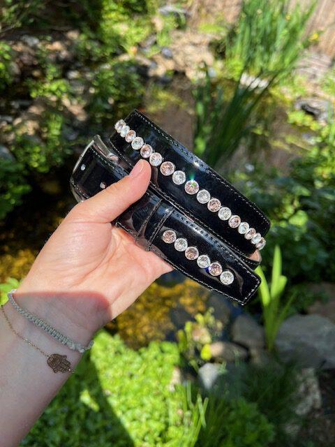 Goede kwaliteit zwarte lak-lederen riem van 35mm breed, helemaal rondom bezet met 1 rij High End crystals (+- 85 crystals). Twijfel je over de kleurencombi die je er graag op wil? Ik kijk graag met je mee! Stuur dan gerust een berichtje, er is erg veel mogelijk!